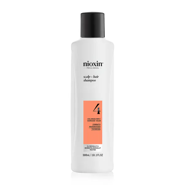 Nioxin System 4 Scalp + Hair Shampoo Progressed Thinning 300 ml è uno shampoo professionale studiato per capelli colorati con diradamento avanzato. Questo shampoo detergente per capelli diradati aiuta a rimuovere il sebo, lo sporco e i residui di prodotti per lo styling dal cuoio capelluto e dai capelli, creando un ambiente ottimale per capelli dall'aspetto più sano. Lascia i capelli freschi, leggeri e visibilmente più corposi.